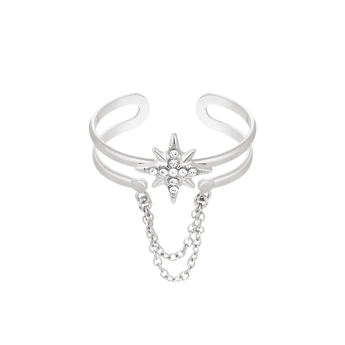 Shop deze toffe gouden ring met leuk sterdetail en kettinkje nu bij AnnaMartha! De ring is gemaakt van stainless steel in combinatie met strass steentjes! Leuk om deze te combineren met meerdere stoere gouden sieraden. Deze ring is verkrijgbaar in de kleuren goud en zilver en is verstelbaar.